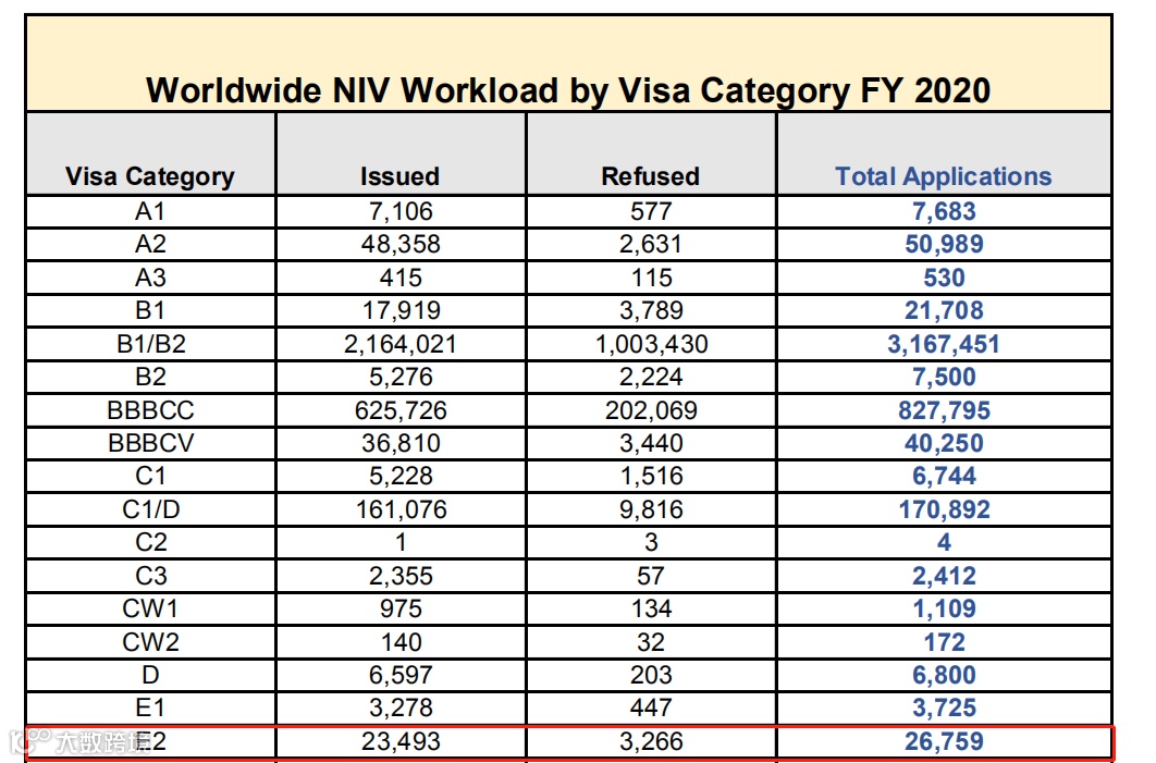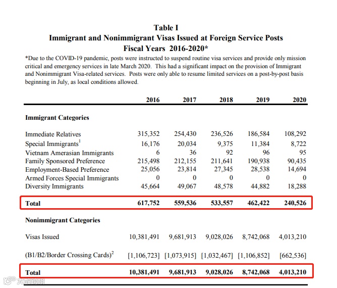 近日,美国国务院公布了2020年各类别签证发放数量。因受到移民及签证政策收紧的影响,且由于疫情原因导致的众多领馆关闭并停止接收签证申请,2020年美国共发放移民类签证240,526个,非移民类签证4,013,210个,签证发放数量仅为2019年的一半。
