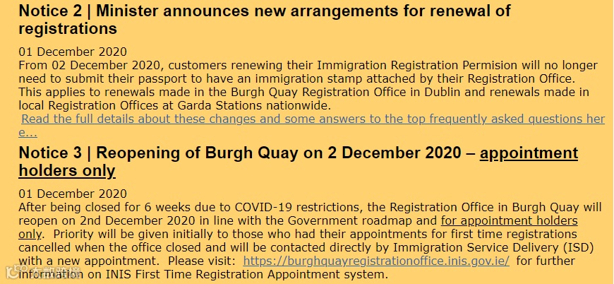 在受疫情影响关闭6周后,Burgh Quay的移民局办公室已于12月2日重新开放,且仅对已预约者开放,将优先考虑那些预约到办公室关闭时间的人士,并会由入境事务处直接联络预约人。