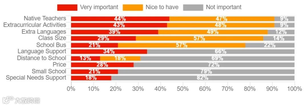 此外,家长们很清楚学习多种语言的优势。近年来随着中国国际化人才理念的深入,让孩子掌握多种语言,不但可以开拓他们的视野,也会让学生们学会接受并包容来自不同国家的文化。调查显示,39%的家长认为一所国际学校提供附加的语言课程“非常重要”(附加语言是指学校教学语言以外的语言)。