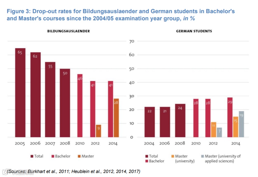 根据德国统计局数据,近几年德国大学每年有约30%左右的德国本科学生退学,国际生退学率约40%。
