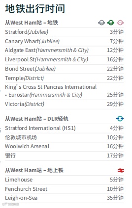最近的地铁站是West Ham,是District Line、Jubilee Line及Hammersmith & City Line 的交汇点 ;在DLR的West Ham站乘坐火车前往伦敦城市机 场需10分钟;伦敦跨城快轨的交汇处位于附近的Stratford站, 距Jubilee Line的West Ham三分钟。横贯铁路高 速快捷,通往Liverpool Street(7分钟)、Canary Wharf(8分钟)、Bond Street(15分钟)及希思罗 机场(49分钟)。