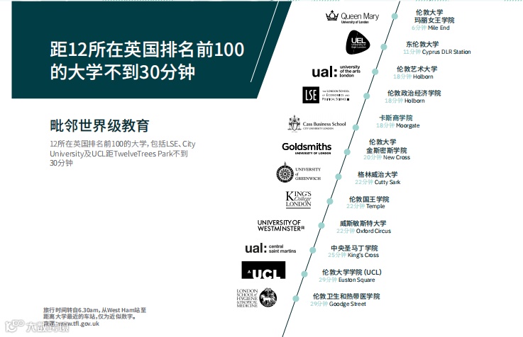 TwelveTrees Park这里的高等教育院校也是触手可及,30分钟内可达12所英国顶尖大学,包括LSE,UCL, Queen Mary,City University等。