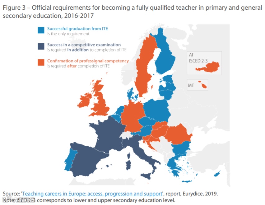 此外,欧盟国家平均师生比例为1:14.7,小班教学的教育理念,让每个孩子都能得到关注。而且,欧盟小学教师起的最低要求是就是学士学位,只有少部分国家(浅蓝色部分)对中小学教师的入职基本要求是获得教师资格(ITE);像爱尔兰、马耳他、英国、瑞典,这些国家,除了获得教师资格外,还需要通过一系列的专业能力资格审核,才可以上岗。