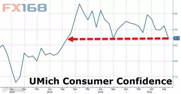 不过,随后公布的消费者信心指数却表现不尽如人意。周五公布的一份报告显示,密西根大学10月美国消费者信心指数终值创2014年10月以来最低,且低于预期和9月终值。