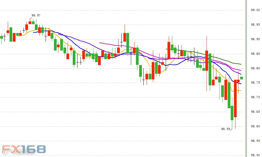 外汇市场:在美国三季度GDP数据公布过后,金融市场再度出现“过山车”行情。美元指数短线小幅拉升至98.91(今日开盘价位),随后震荡下滑并刷新日低至98.59。