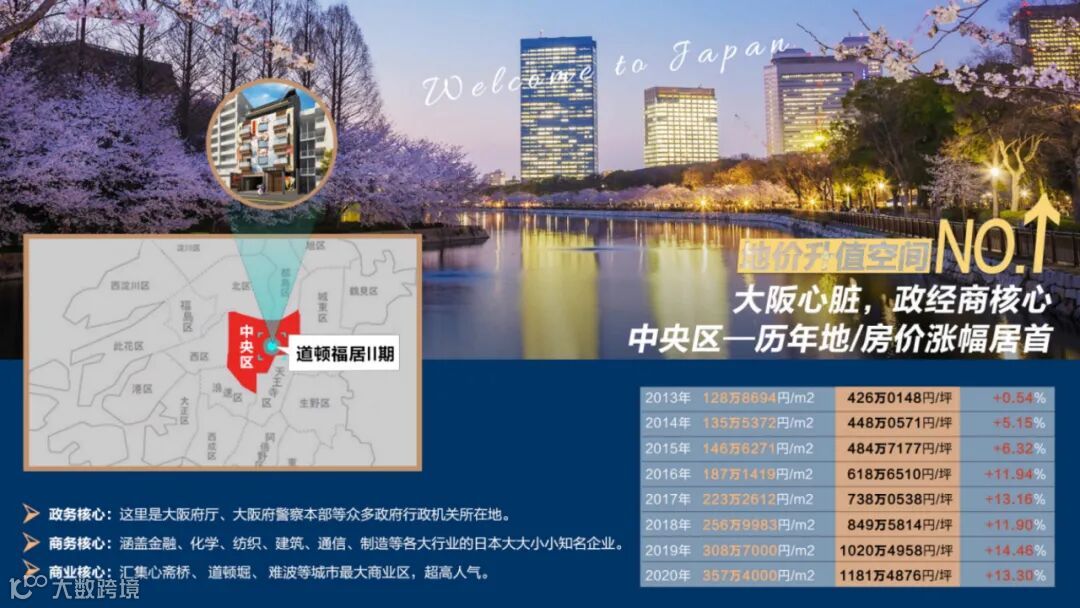 1.即使目前仍处于疫情期间,中央区地价历年来涨幅始终居大阪榜首。