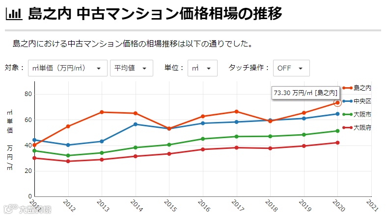 项目位于国际大都市大阪市的中心地区——中央区,是寸土寸金地段下的高性价比现房公寓项目。据日本知名房产数据统计,截止到2020年中央区岛之内区域二手公寓平均每平米单价为73.3万日元 /㎡,且疫情并没有对中央区二手房公寓售卖价格造成影响,自2018年起已连续2年上涨;同时岛之内地区平均每平米单价明显高于中央区平均每平米单价价格。