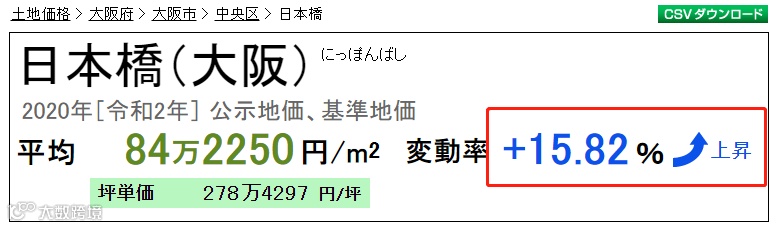 2.日本桥周边即道顿福居项目所在地区一带,地价更是飙高,涨幅可达15.82%.