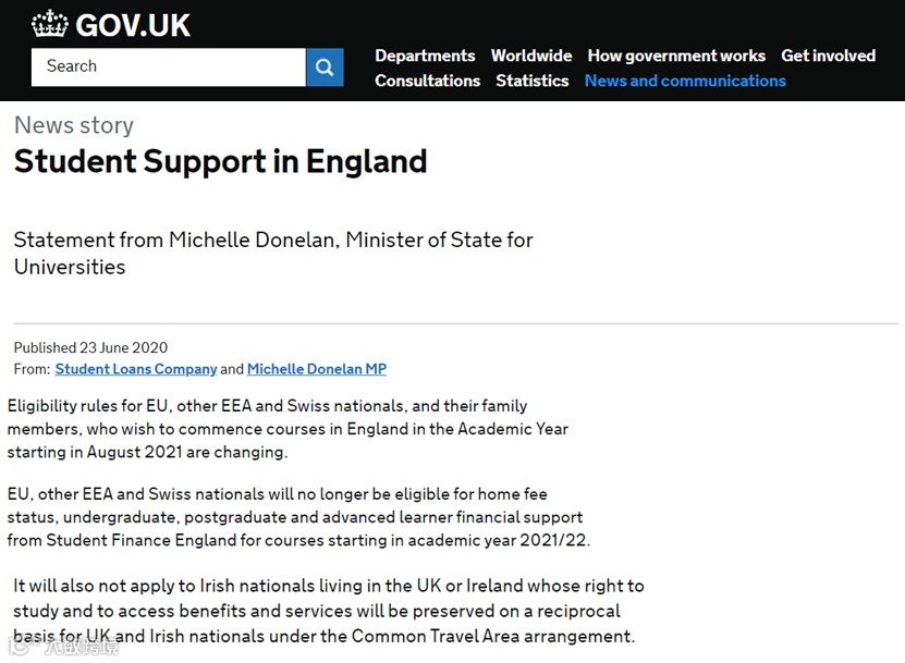 这将不影响2020/21学年开始上课的学生,也不影响根据欧盟脱欧协议、欧洲经济区和欧洲自由贸易区分离协议或瑞士公民权利协议,已获得英国公民权利的欧盟、EEA经济区和瑞士公民。