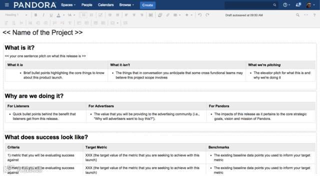 发布计划文档(Lauch Plan Document):一份包括所有执行计划的综合性文档,用来协调产品、销售、营销和开发等各个团队之间的工作。这是两年多以前由于Pandora团队规模扩大而新增的文档。