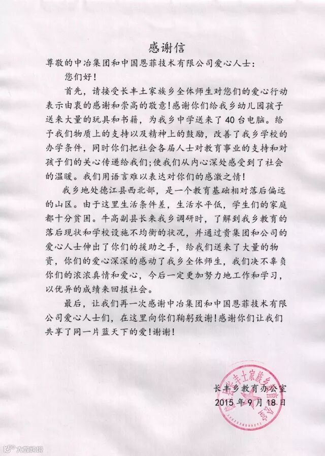 情系德江,捐物留香。中冶集团和中国恩菲的善举让德江人民感动不已,德江县人民政府特地发来感谢信,以表达对集团和公司对德江县教育事业鼎力相助、对德江人民怀有深切情谊的诚挚谢意。