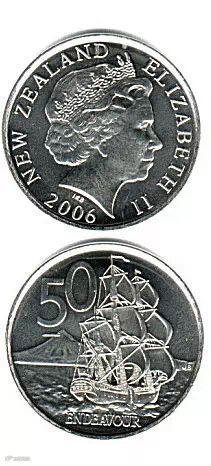 50分硬币上的图案则是英国航海家詹姆斯·库克船长的“奋进号”三桅帆船,背景是南岛库克峰。