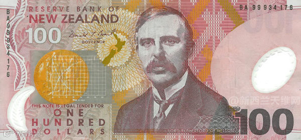 100元纸币正面是新西兰著名物理学家欧内斯特·卢瑟福以及他1908年获得的诺贝尔奖章。卢瑟福发现了原子核,改变了人们对物理学的理解。