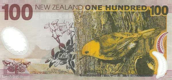 100元纸币背面是新西兰南岛风景如画的埃格林顿山谷和新西兰金丝雀优雅的身影。