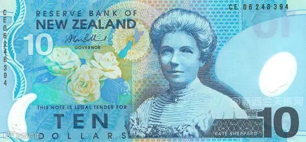 10元纸币正面,印有女权运动领导人凯特·谢伯特的头像。新西兰人用这种方式,纪念新西兰成为第一个给予妇女选举权的西方国家。