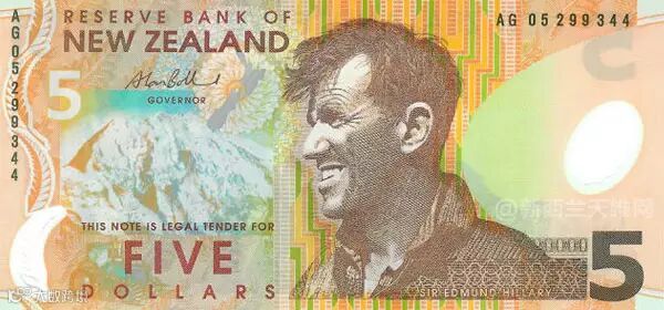 5元纸币正面显著位置是埃德蒙·希拉里爵士的头像。他是首个征服世界最高峰珠穆朗玛峰的登山家,一生致力于探险和慈善,备受新西兰人爱戴。