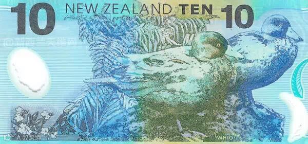 10元纸币背面是栖息在新西兰山地的濒危物种山蓝鸭,以及特有的蕨类和水仙类植物。