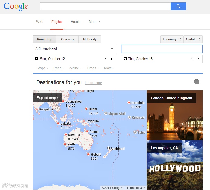 搜索廉价机票的需求已很普遍,Google 航班搜索器算得上是最简易的机票比价工具,输入出发地、目的地、出发日期即可完成。它支持添加多个目的地,并且在选择日期的下拉菜单,会同时显示每日票价,下方还会以图表的形式展示出价格走向。
