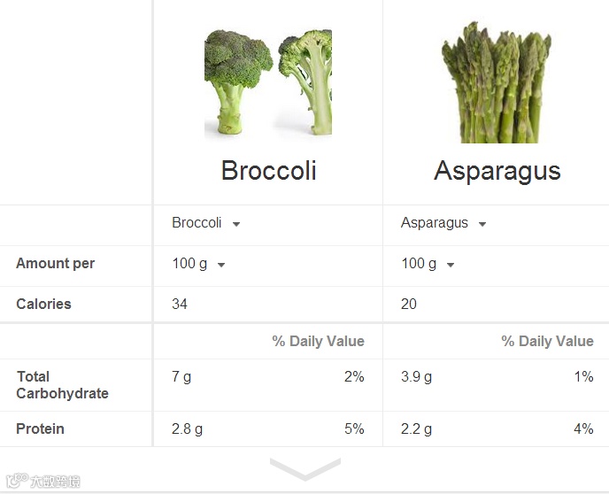 橘子和香蕉哪个更营养?这个问题现在只要在 Google 搜索框中打入「campare」就能解决了。例如你想知道花椰菜和芦笋哪个更具营养价值,输入「campare broccoli and asparagus(对比花椰菜和芦笋)」即可获得答案。