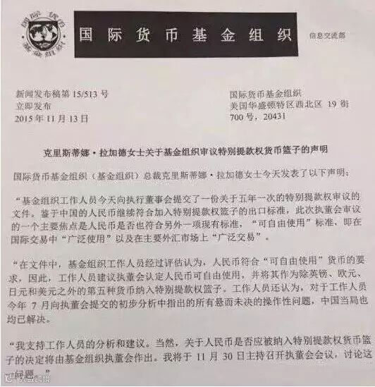 北京时间11月14日清晨,根据国际货币基金组织(IMF)突然发布IMF总裁拉加德关于特别提款权货币篮子(SDR)的声明!我们来看看拉加德是怎么说的。
