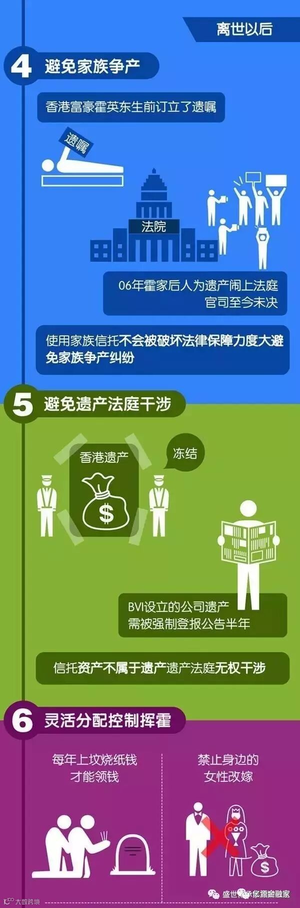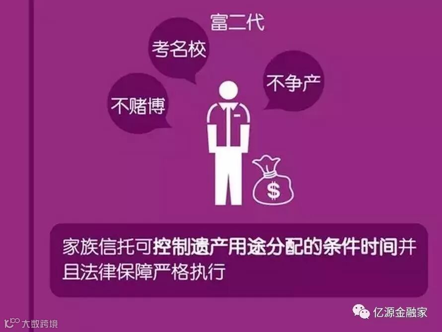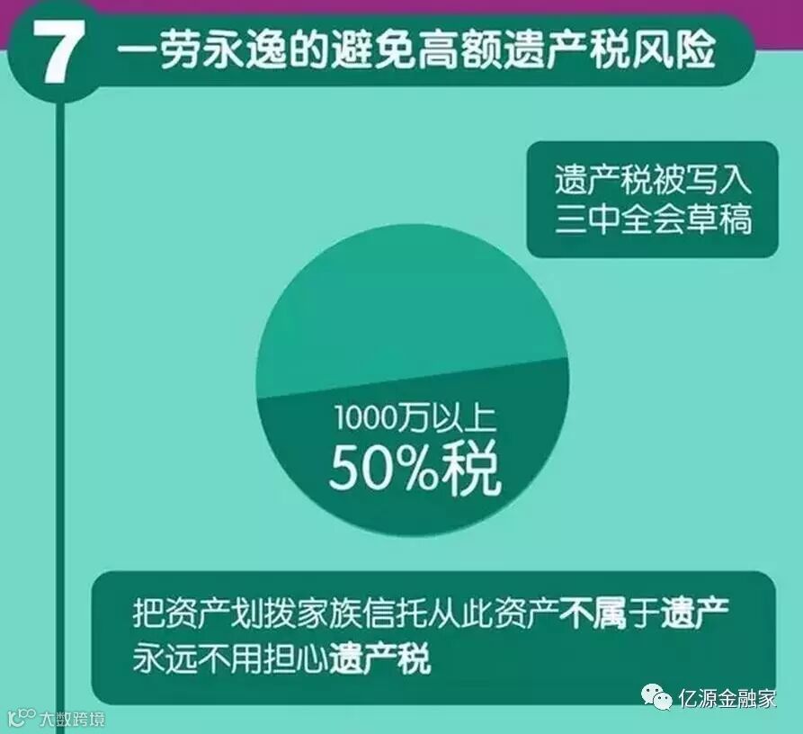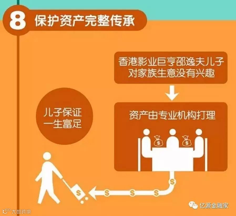 避税作用。虽然中国尚未推出遗产税,但这或许是迟早之事;针对境外资产,不少欧美国家都规定了遗产税,在要进行遗产继承的时候如果没有先行以现金方式缴纳高达资产价值50%的遗产税,那么房产无法完成继承和过户。特别是移民美国的客户,面临遗产税家族信托是必不可少的工具之一。