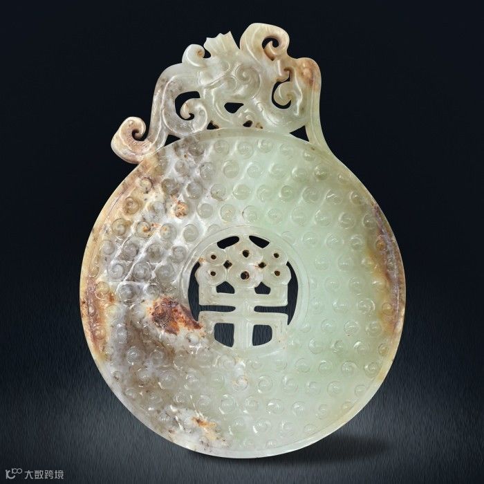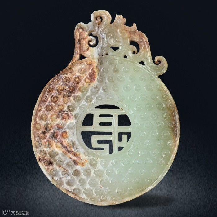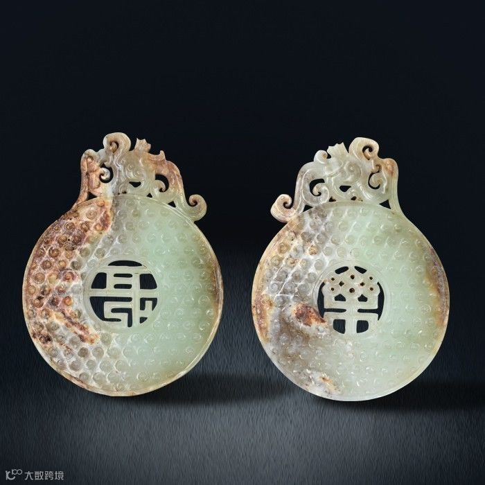 玉質溫潤,玻璃光澤,紋飾繁密,精工細作,大部分有褐色沁,出廓部分雕雙龍紋,勾連雲紋,陰線刻劃精細,尤為難得,值得收藏。玉璧是中國玉器中出現最早並一直延續不斷的品種,是很重要的瑞玉,戰國至兩漢是玉璧的鼎盛時期,用玉選料極精,製作工藝極細,花紋形式多變,飾紋種類極為豐富,使用範圍大增,數量也屬歷代之冠。