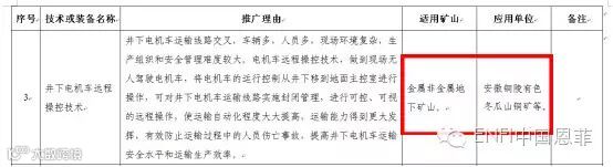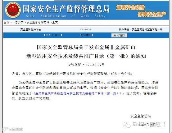 2015 年,该项技术还被列入国家安监总局首批《金属非金属矿山新型适用安全技术及装备推广目录》。