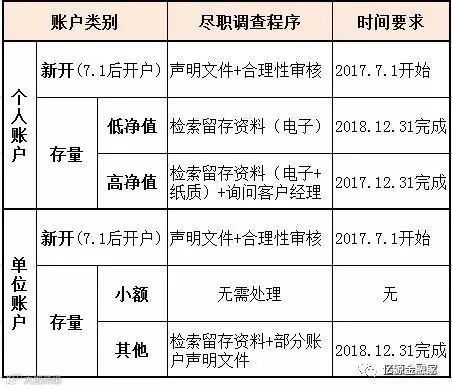 在2018年年底前完成对存量个人低净值账户和全部存量机构账户的尽职调查。
