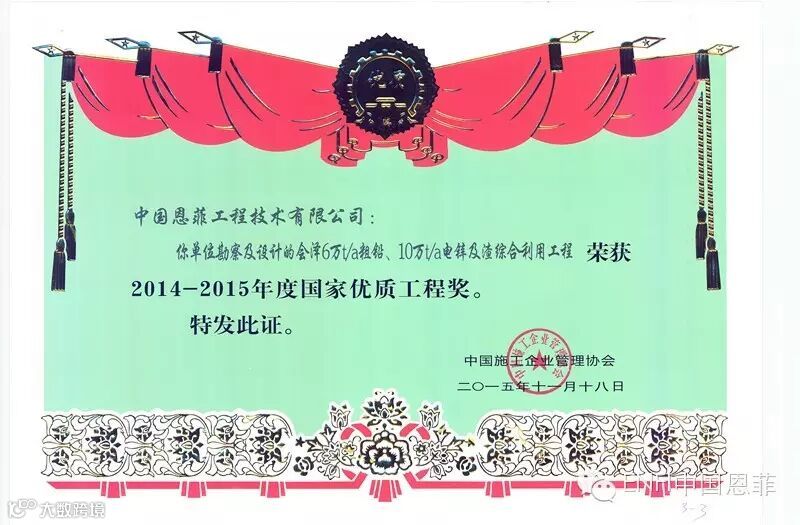 12月18日,“2014-2015年度创建国家优质工程总结表彰大会”在北京饭店金色大厅隆重举行。会上由中国恩菲承担总体工程设计、热渣侧吹工程总承包的云南驰宏锌锗股份有限公司会泽6万吨/年粗铅、10万吨/年电锌及渣综合利用工程荣获“2014-2015年度国家优质工程奖”。项目负责人李炬荣获“国家优质工程奖突出贡献者”光荣称号。