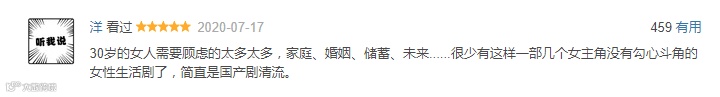 ▲网友#洋 #:30岁的女人需要顾虑的太多太多,家庭、婚姻、储蓄、未来......很少有这样一部几个女主角没有勾心斗角的女性生活剧了,简直是国产剧清流。