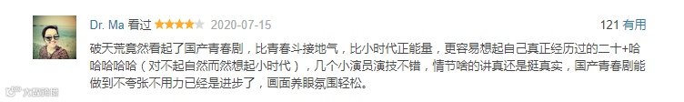 ▲网友#Dr. Ma#:破天荒竟然看起了国产青春剧,比青春斗接地气,比小时代正能量,更容易想起自己真正经历过的二十+哈哈哈哈哈(对不起自然而然想起小时代),几个小演员演技不错,情节啥的讲真还是挺真实,国产青春剧能做到不夸张不用力已经是进步了,画面养眼氛围轻松。