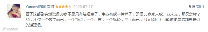 ▲网友#Yummy的喵#:看了这部剧突然觉得30岁不是只有结婚生子,事业有成一种样子,即便30岁家未成、业未立,那又怎样?30,不过一个数字而已,一个钟点,一个月末,一个标价,三十而已,那又如何?可能这也是这部剧要讲的道理吧。