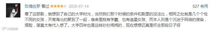 ▲网友#玫瑰佐罗#:看了这部剧,就想到了自己的大学时光,当然我们那个时候的条件和剧里的没法比,相同之处就是几个个性不同的女孩,天南海北的聚到了一起,宿舍里既有学霸、也有追星女孩、而本人则是个沉迷于网络的废柴,捂脸,简直太有代入感了。大学四年也是这样吵吵闹闹的,现在想想还真是怀念那段日子呀
