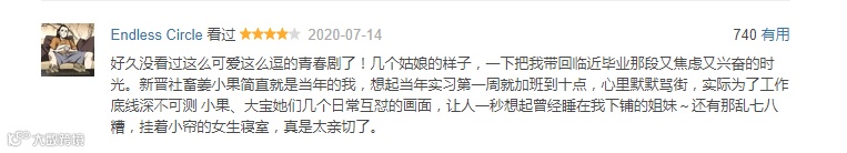 ▲网友#Endless Circle#:好久没看过这么可爱这么逗的青春剧了!几个姑娘的样子,一下把我带回临近毕业那段又焦虑又兴奋的时光。新晋社畜姜小果简直就是当年的我,想起当年实习第一周就加班到十点,心里默默骂街,实际为了工作底线深不可测 小果、大宝她们几个日常互怼的画面,让人一秒想起曾经睡在我下铺的姐妹~还有那乱七八糟,挂着小帘的女生寝室,真是太亲切了。