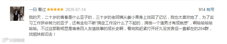 ▲网友#一码#:我的天,二十岁的青春是什么亚子的,三十岁的老阿姨从姜小果身上找回了记忆,我也太喜欢她了,为了实习工作拼命努力的亚子,还有金句不断“搞定工作没什么了不起的,搞倒一个渣男才有成就感”,啊哈哈哈哈哈哈。不过这部剧明显是宿舍四人友谊故事的成长史啊,看完我赶紧打开好久没发言但一直都在的宿舍群,找姐妹叙旧去!