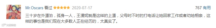 ▲网友#Mr.Oscars#:三十岁在外漂泊,孤身一人,王漫妮就是这样的上漂,父母时不时的打电话让她回家工作或者劝她相亲,这样的事也是我们现在大多数人正在经历的,太真实了。