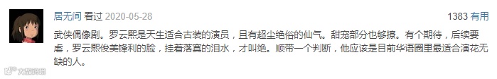 ▲网友#居无间#:武侠偶像剧。罗云熙是天生适合古装的演员,且有超尘绝俗的仙气。甜宠部分也够撩。有个期待,后续要虐,罗云熙俊美锋利的脸,挂着落寞的泪水,才叫绝。顺带一个判断,他应该是目前华语圈里最适合演花无缺的人。