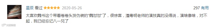 ▲网友#星辰#:太喜欢魏书这个带着卷卷头发伪装的“魏怼怼”了,很惊喜,潘粤明老师的演技真的没得说,演啥像啥,对不起,我已经忘记八一兄了。