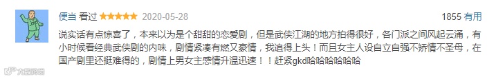 ▲网友#便当#:说实话有点惊喜了,本来以为是个甜甜的恋爱剧,但是武侠江湖的地方拍得很好,各门派之间风起云涌,有小时候看经典武侠剧的内味,剧情紧凑有又燃又豪情,我追得上头!而且女主人设自立自强不矫情不圣母,在国产剧里还挺难得的,剧情上男女主感情升温迅速!!赶紧gkd哈哈哈哈哈哈。