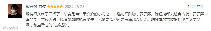 ▲网友#熊升树#:期待很久终于开播了!毕竟是当年最喜欢的小说之一!选角很贴切,罗云熙、陈钰琪都太适合古装!罗云熙真的是上官透天选,风度飘飘的执扇少年,无论是造型还是气质都没话说。陈钰琪的古装扮相也是又美又飒,和重雪芝的气质超搭。