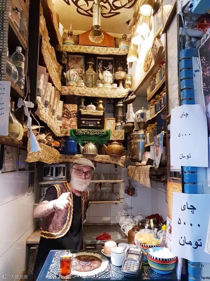 三面墙,一个桌子,一共不到2平方米,但是充满了温馨。一个很慈祥的老爷爷,站在中间。背后的墙上摆着茶叶,咖啡,香料,沏茶煮咖啡的工具,都散发出浓厚的波斯风味。