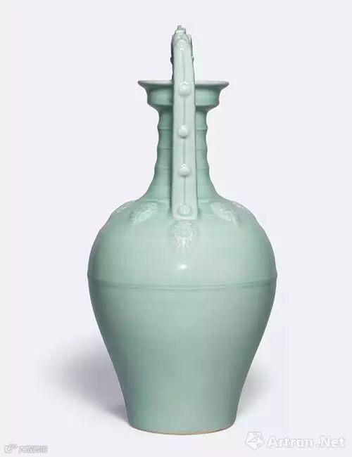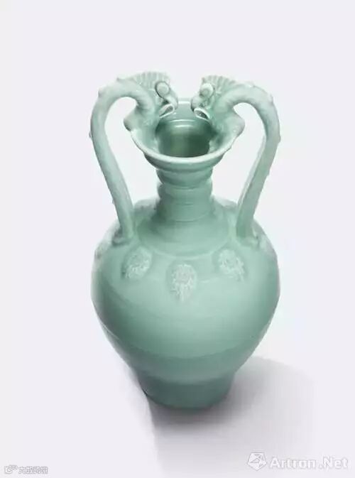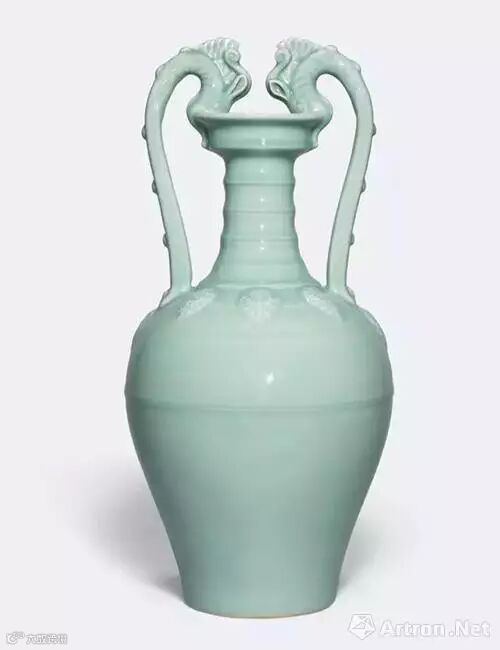 雙龍尊自五代後消失,至清代雍正官窑複現,雍正朝之後除乾隆早期尚有少量燒制外,之後又銷聲匿跡。清朝雍正帝非常重視禦制瓷器,常委託禦窑廠製作仿古式樣,此雙龍尊仿唐朝傳瓶式樣,青翠瑩潤的釉汁則仿照宋代龍泉青瓷。雍正時景德鎮窑廠燒制的雙龍尊分兩種尺寸,第一種較小,約32釐米左右;第二種較大,約52釐米左右,拍品屬較大的一類,而要燒制如此龐大且器形複雜的瓶子難度極高,所以同類傳世品少見。現時傳世的雍正粉青釉雙龍尊只有四件,本拍品是其中之一,亦是屬私人收藏裏唯一品相完美的一件,另外三件分別藏瀋陽故宮博物院、美國克利夫蘭藝術博物館及加州陳氏典藏博物館。