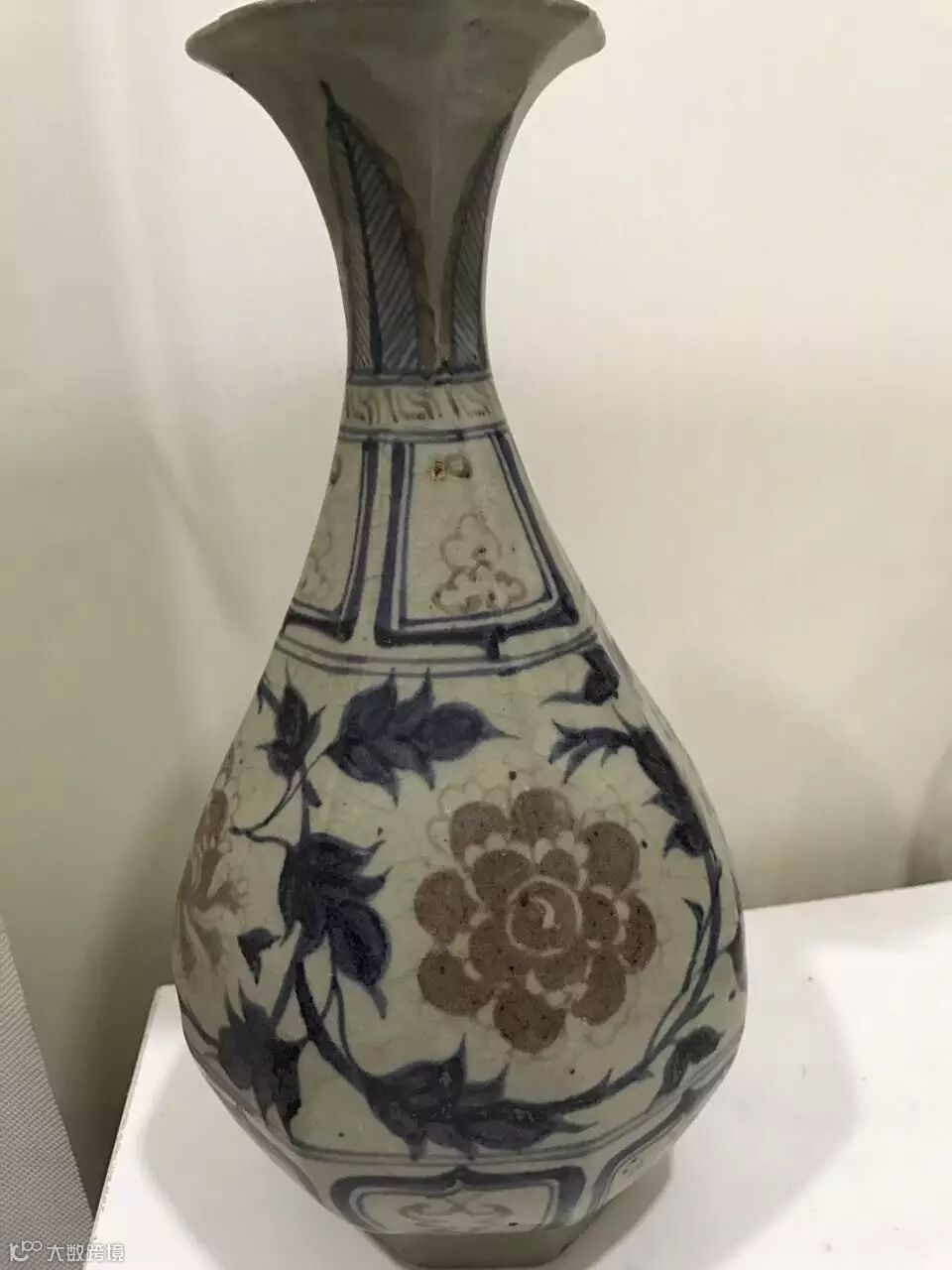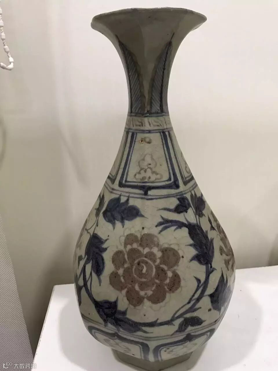 此器:口徑:9cm高30.7cm低徑:8.7cm,口外撇,頸較細,頸部中央微微收束,頸部向下逐漸加寬過渡為杏圓狀下垂腹,曲線變化圓緩;圈足相對較大。為典型元代青花釉裡紅常見器型。極具收藏價值。