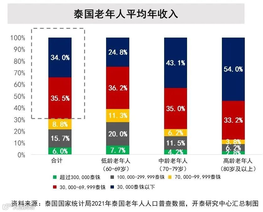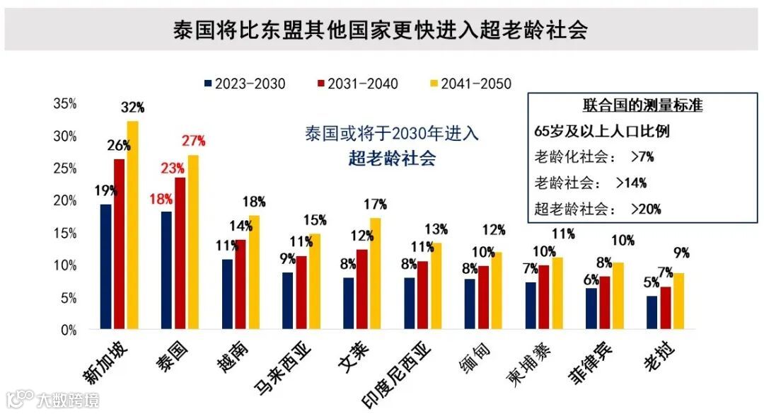 泰国将成为世界上第一个进入超老龄社会(Super-aged Society)的发展中国家。作为中等收入国家的泰国自2005年起进入老龄化社会(Aging Society)。2022年泰国65岁以上老年人口已超过1,200万,占泰国总人口的六分之一。2023年泰国已正式进入老龄社会(Aged Society)。