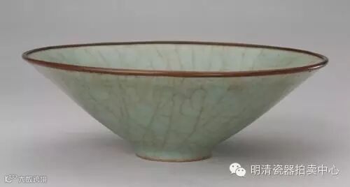 宋官窑葵瓣口碗(图15) 口径19.2厘米、足径5.4厘米、高7.9厘米。故宫博物院藏。在宋代,葵瓣口碗是极为流行的造型。此碗釉色莹润,凝厚典雅。釉面布满开片纹,片纹较为密集,口部釉面产生的垂流,把含铁较高的褐紫色胎骨若隐若现地表露出来,圈足刮釉,呈铁色,具有“紫口铁足”的特征。