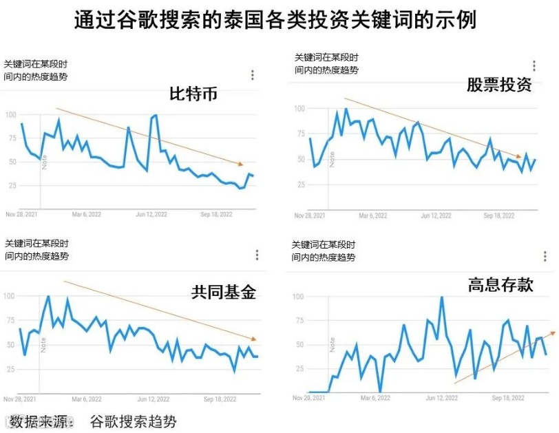 泰国投资者对风险资产的投资需求也受到影响,这体现在对“比特币”、“投资股票或股权”和“共同基金”等关键词的搜索频率逐渐下降,而对“高息存款”关键词的搜索频率却呈上升走向。除此之外,投资者的注意力还分散到民间部门的债券,与2022年发行的私营企业债券数量不断增加的态势相一致。