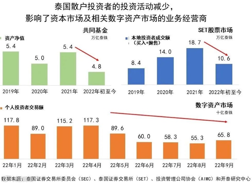 泰国资本市场和数字资产市场的业务经营商受到国内投资者交易减少的影响,体现为共同基金业的总资产净值(NAV)有所下降;对于股市,2022年前6个月证券经纪公司的净利润出现了下跌和泰国股市散户投资者的交易额低于去年同期;数字资产市场方面,交易活动的活跃度有所下降,体现为国内市场交易额自2022年5月国外开始出现大量有关数字资产的负面新闻以来持续下降。