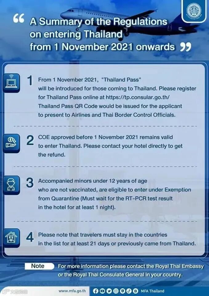 答:自2021年11月1日起,所有通过航空入境的旅客都必须申请泰国通行码(Thailand Pass)