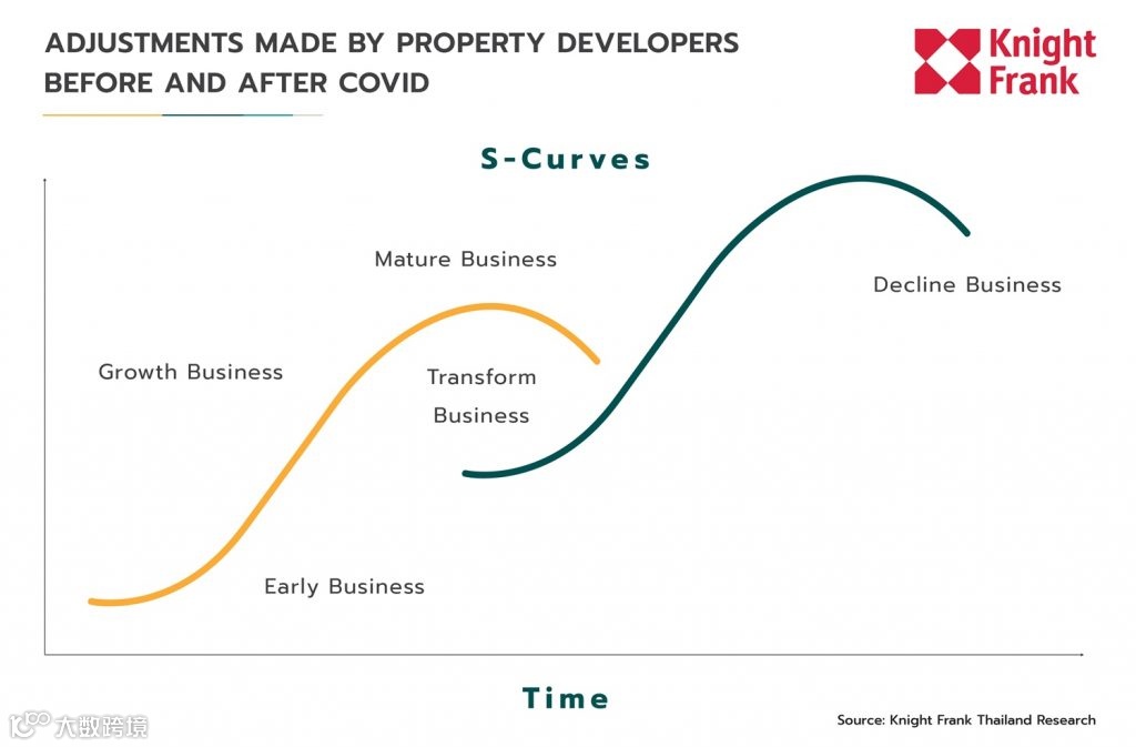房地产的开发可以用 S 曲线模型来解释,该模型从底部开始,增长越来越快,直到达到增长停滞的点。 进入新的行业或业务可以帮助住宅开发商保持其业务的连续性。 住宅开发商的一个自然转变是将其业务多元化开拓至商业不动产市场,例如围绕其核心业务的酒店和写字楼,以减少对住宅市场的供应并在未来维持收入和利润增长。这些开发商面临着不同的挑战,例如选择一个具有高上升潜力的行业,在这个行业里他们可以增加价值并与现有的行业所有者竞争。