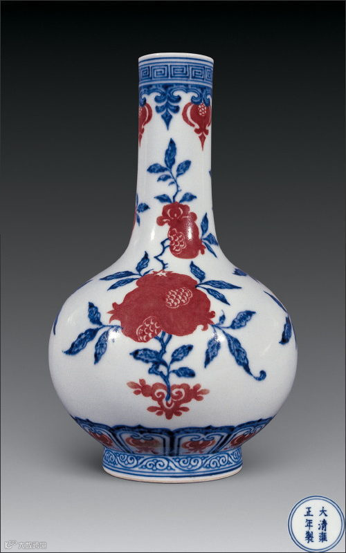 该瓶为雍正朝典型风格的器物。其直口,长颈,鼓腹,圈足,口沿用青花描绘一道连环回纹,下面吊饰三组青花尖叶纹并间绘上三个釉里红变形石榴,颈腹部描绘“三多果纹”,分别是折枝蟠桃、折枝石榴、折枝荔枝,它们都由一朵灵芝承托,使整个构图增添祥瑞之气。画中硕果细叶,疏密有致。红艳夺目的三多果强烈突显其寓意的主题。传统常见三多是以佛手、桃、石榴组合纹饰,其中佛手寓意福气,桃寓意多寿,石榴寓意多子。三者结合,寓意多福、多寿、多子。而雍正一朝的瓷器上许多三多纹饰均以荔枝取代佛手,究其原因很可能与雍正帝个人喜好有关。